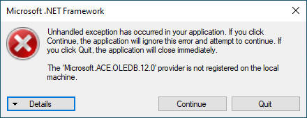 If you see an error related to Microsoft.ACE.OLEDB.12.0: